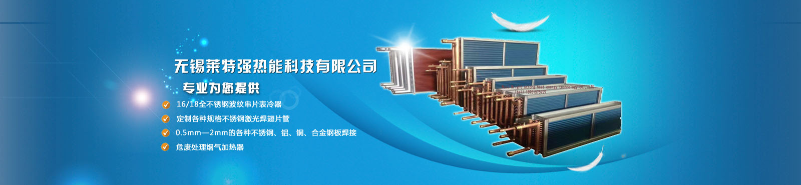 無錫萊特強熱能科技有限公司是專業(yè)生產(chǎn):銅鋁復(fù)合散熱器、鋼制散熱器、鋼鋁復(fù)合散熱器、(鋼鋁、銅鋁復(fù)合,鋼帶鋼管、不銹鋼、高頻、全銅軋制)等翅片管,空氣熱交換器,熱管換熱器,空氣冷卻器,螺旋板式換熱器,列管換熱器,冷凝器,煙氣加熱器、余熱回收、TSR盤管的公司。